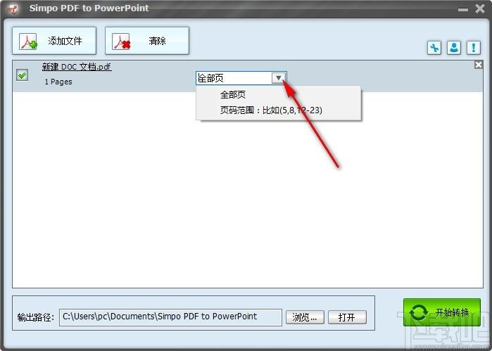 3、点击下拉按钮,可选择全部页,也可选择页码范围